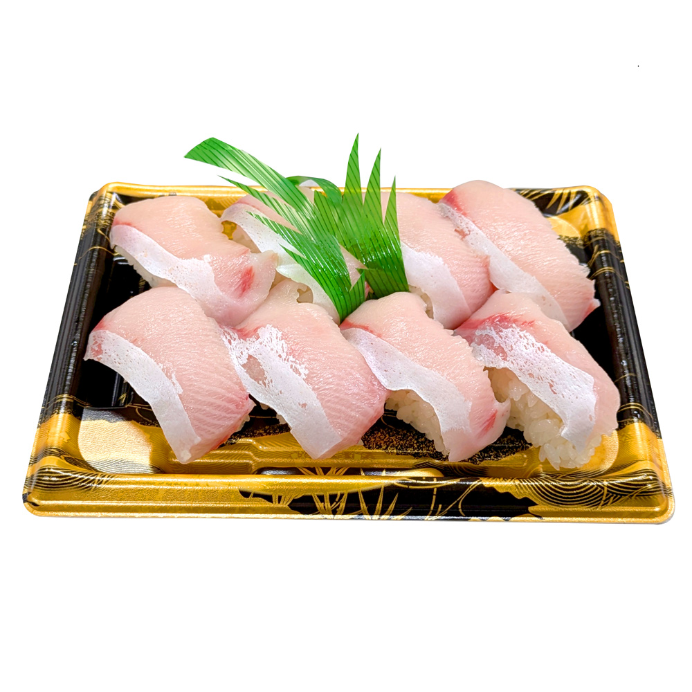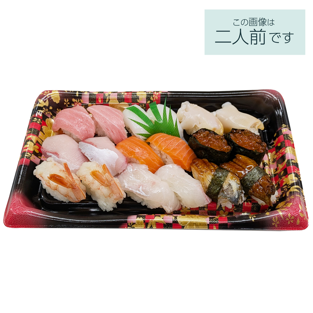 内容(1人前):中トロ1貫、ぶり1貫、エビ1貫、イカ1貫、サーモン1貫、たい1貫、梅貝1貫、いくら軍艦1貫、あなご1貫