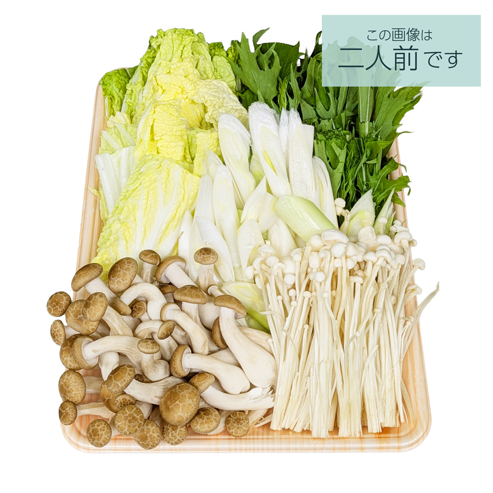 内容(1人前):えのき約70g、しめじ約120g、ネギ約130g、白菜約130g、水菜約40g