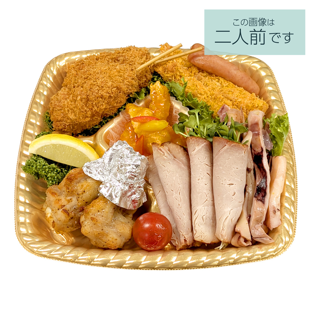 内容(1人前):串カツ1本、海老フライ1本、あぶりチキン1個、エビチリ2個、叉焼2枚、イカ焼き約5切
