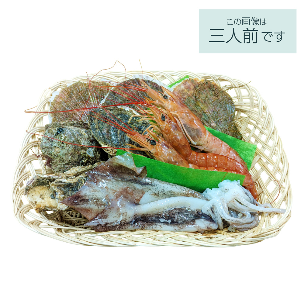 内容(1人前):するめイカ1杯、赤エビ1尾、岩がき1個、殻付きホタテ1個